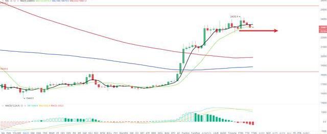 目前,從日線圖來看,5日均線和13日均線,還未死叉。且連續三天下跌的跌幅還沒有2月2日當天漲幅多,目前處于多頭強勢中。如果大餅需要往下走,必須要跌破2月2日當天跌點22760。