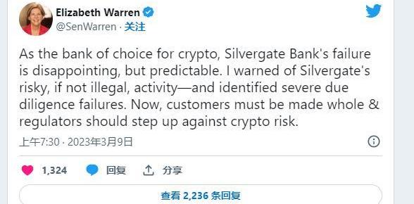 美國參議員伊麗莎白沃倫最近在推特上表示,銀門銀行的破產令人遺憾但并不令人意外,因為它是加密貨幣的首選銀行。她說她發現了嚴重的盡職調查缺陷,并對Silvergate的危險和犯罪行為提出了警告。客戶現在需要得到補償,監管機構需要采取行動應對加密貨幣的危險。