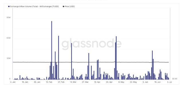 最后是BUSD和TUSD兩個穩定幣的市值變化,同樣也是以美國的活躍時間為主,BUSD目前是沒有增加的可能,市值在最近一周也是降低了1.1億美金,僅僅是BUSD的市值減少幾乎就抹平了USDT市值的增加,甚至不能排除BUSD中市值減少的部分轉移到了USDT中,所以實際上來自外部資金的增加可能非常的有限,同樣TUSD的市值也沒有能繼續維持在高點,最近一周也降低了超過9,000萬美金,如果綜合來看,在上一周中幣市四個主力穩定幣的總市值降低了11.6億美金左右,這所代表的就是幣市流動性的繼續萎縮,還記得我們之前聊過的美債抽血的事情嗎?現在就已經在發生了,上周USDT的增長量是上半年最低的,而USDC的離場卻在加速發生。