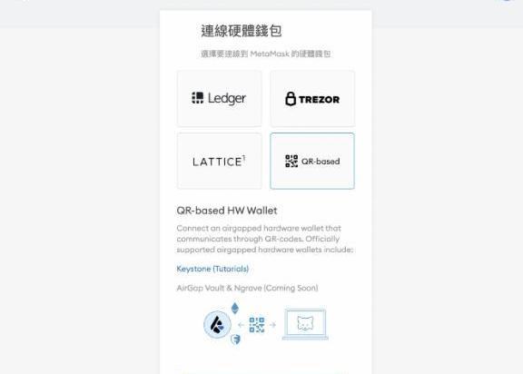 在MetaMask點擊個人頭像,選取「連線硬體錢包」進入下一頁面,并選擇QR-based即可掃描剛剛取得的QRCode進行連接。