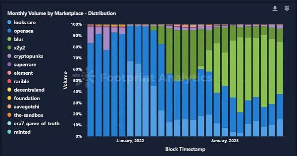 交易市場: Opensea, LooksRare, Blur, X2Y2, Cryptopunks, Rarible, SuperRare, Foundation, Decentraland, Aavegotchi, Element, Era7, the Sandbox, Minted