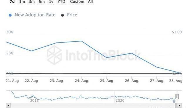 根據IntoTheBlock的信息,只有41%的代幣持有者獲得收益,而56%的持有者面臨損失。此外,該代幣的新采用率急劇下降。該指標反映了在特定日期所有活躍地址中進行初始交易的新創建地址的比例。