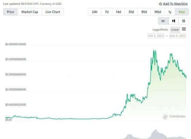 這筆10,000美元的投資在不到30天的時間內激增至170,000美元,并于2023年3月3日創下0.000000099219美元的歷史新高。