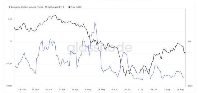 雖然價格暴跌,但ETH的鏈上指標發生了一些有趣的發展。Glassnode的數據顯示,以太坊的交易所流出量剛剛達到一個月低點14,564,884.80美元。這種下降表明ETH的價格在未來幾天內進一步暴跌,因為交易所流出量的減少通常是一個看跌信號。