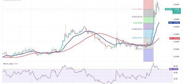 多頭正試圖阻止四小時圖表上50日移動平均線的回調。這是一個積極的跡象。然而,20日均線和相對強弱指數在中點附近趨平表明積極勢頭可能正在減弱。如果價格跌破當前水平或上方阻力位0.06美元,并跌破50日移動平均線,則將標志著更深層次調整的開始。XDC/USDT貨幣對隨后將滑至50%斐波那契回撤位0.05美元。