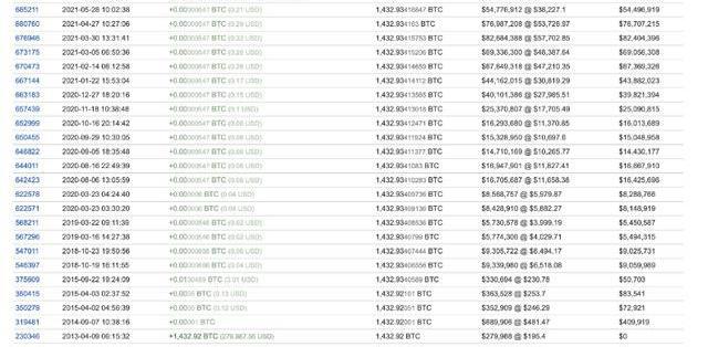 區塊鏈跟蹤器Lookonchain表示,自2013年4月以來一直處于低位后,這個長期休眠的地址已經移動了1,432個比特幣。