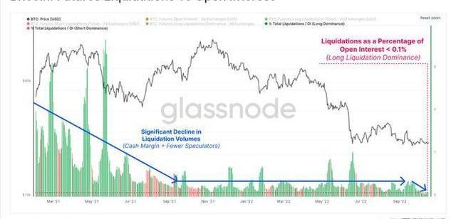 在此之后,我們可以評估多頭和空頭清算總額占所有期貨合約總未平倉量的百分比。這提供了對通過清算而非酌情平倉清算未平倉頭寸比例的洞察。