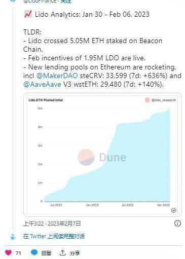 2023年2月7日,LidoFinance發布了對協議中加密貨幣新里程碑的分析。根據加密分析公司DuneAnalytics的儀表板,通過該平臺在信標鏈上質押的ETH數量激增至超過505萬。按當前價格計算,這些加密貨幣價值約82.6億美元。