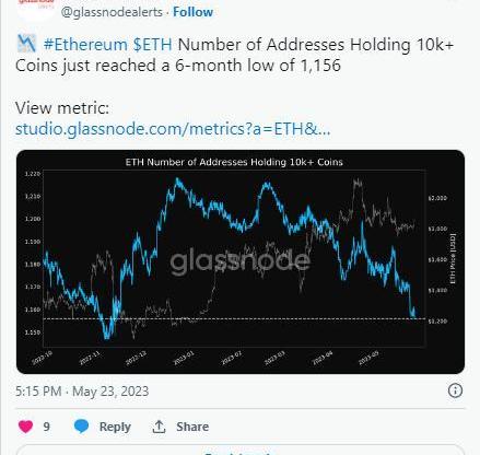 根據Glassnode于2023年5月23日發布的推文,擁有超過10,000ETH的地址數量達到六個月低點1,156。這看起來令人擔憂,因為它暗示該代幣面臨拋售壓力。