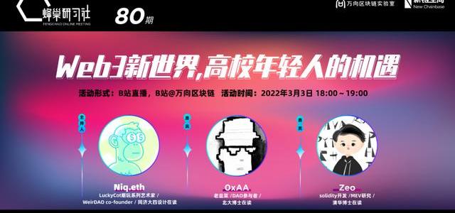 XRP/HKD+1.84%原標題:《萬向區塊鏈蜂巢研習社:Web3新浪潮將會給年輕人帶來什么樣的機遇》在Web3的浪潮里,年輕人有什么機遇?萬向區塊鏈蜂巢研習社線上公開課直播間第80期,邀請了LuckyCot潮玩系列藝術家/WeirDaoco-founder/同濟大學工業設計在讀生Niq.eth、DAO參與者/北大博士在讀生OxAA、solidity開發/MEV研究/清華博士在讀生Zeo,結合自己的經驗和所學,分享隨著Web3的發展,年輕人能獲得哪些機遇。下文根據速記整理,略有不影響原意的刪改。僅代表嘉賓個人觀點,不代表萬向區塊鏈立場。
