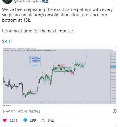 CredibleCrypto表示:“自15k觸底以來,我們一直在對每一個吸籌/盤整結構重復完全相同的模式。差不多到了下一次沖動的時間了。”