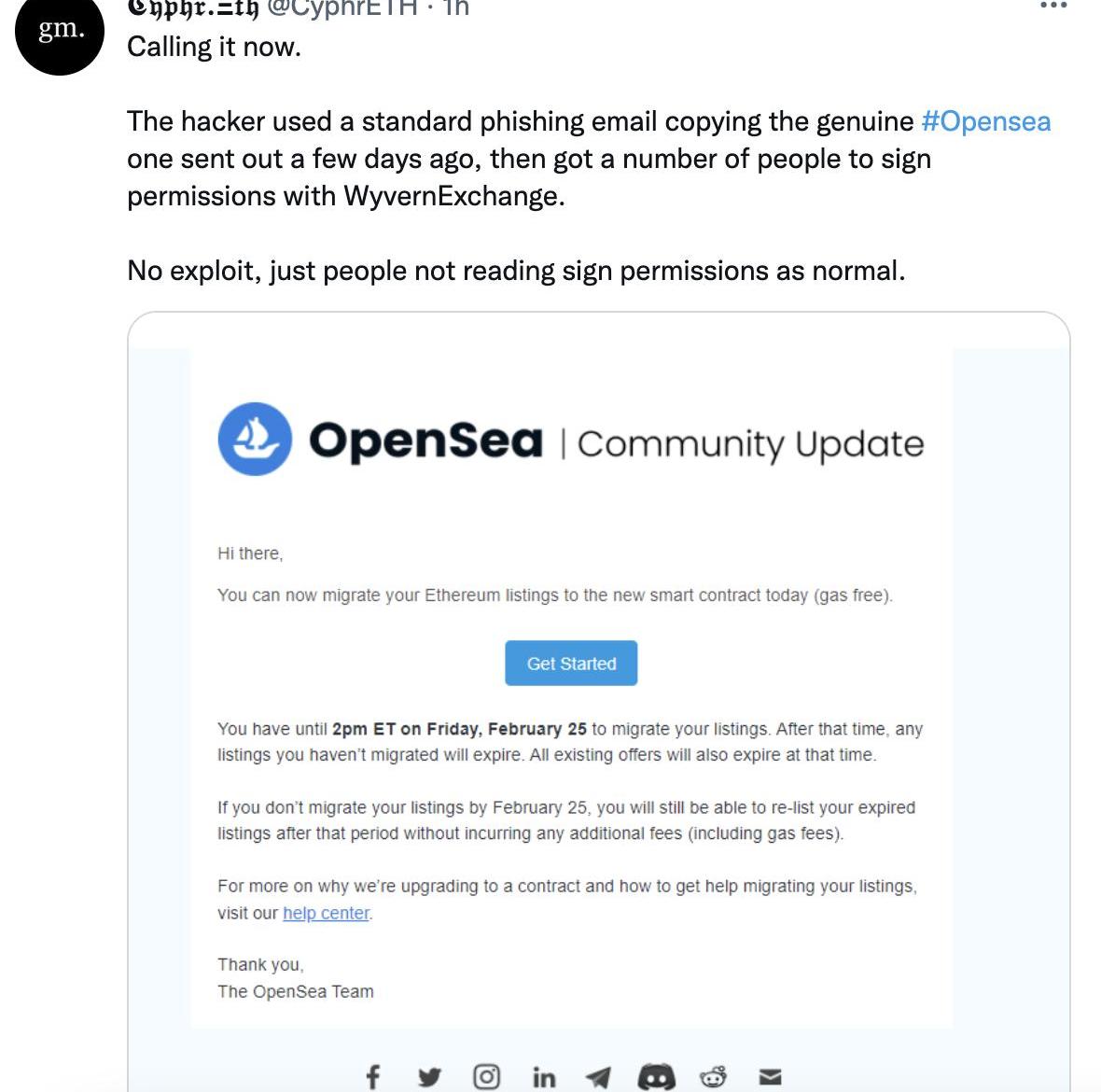 gmDAO創始人Cyphr.ETH發推表示,黑客使用了標準網絡釣魚電子郵件復制了幾天前發生的“正版OpenSea”電子郵件,然后讓一些用戶使用WyvernExchange簽署權限。OpenSea未出現漏洞,只是人們沒有像往常一樣閱讀簽名權限。