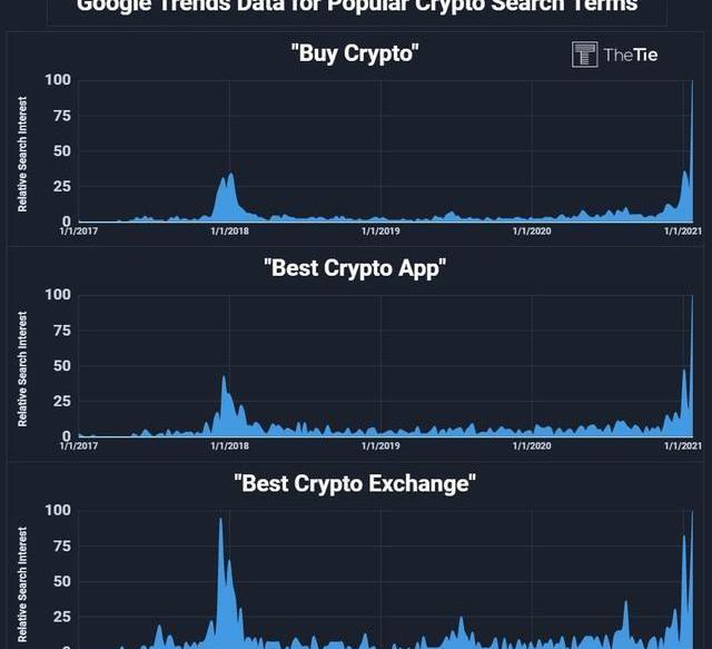 加密貨幣分析公司TheTie表示,今年1月,谷歌上“購買加密貨幣”一詞的搜索量飆升至歷史新高,遠遠超過了之前2018年初的峰值。