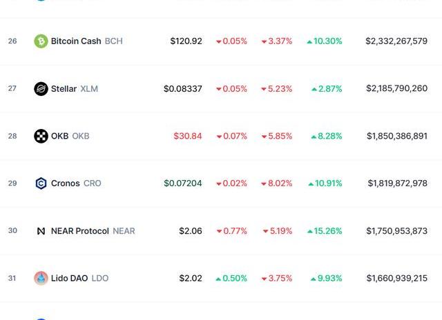 此外,跌幅前三的分別是狗狗幣、克羅諾斯和門羅幣,過去24小時跌幅分別為8.42%、8.02%和7.88%。
