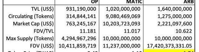 2)與$OP和$MATIC$ARB的類似FDV是可以接受的。FDV/TVL值按比例與$OP和$MATIC進行比較后,就可以估算出$ARB的價格。
