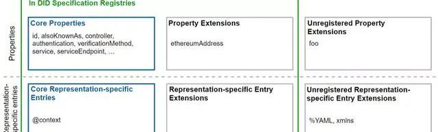 圖5:DIDDoc示例DIDDoc可以被看作是一個身份信息地圖,如圖6所示由兩部分組成,第一部分被稱為標簽,在DIDDoc中可以查詢到并可以直接閱讀的內容,包括三部分:核心標簽、拓展標簽、以及一些未在W3CDID規范登記的標簽;第二部分是未在DIDDoc列出,而是借助URL等特定形式,鏈接到第三方平臺或網站系統查詢相關身份信息;為了保證最大程度的互操作性和信息兼容性,W3C建立了DIDSpecificationRegistry,保證特定形式的內容在DIDDoc中是可以被識別和解析的。當有新的標簽出現,相關平臺或系統需要向DIDSpecificationRegistry登記。