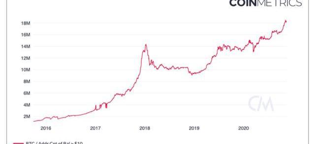 這張圖表顯示了比特幣賬戶上擁有價值10美元或以上資產的地址數量。這遠遠高于2017年底的水平。這表明比特幣的供應正變得越來越分散,特別是以散戶投資者一致的規模批量供應。對于其他閾值,無論是1美元、100美元還是1000美元,在歷史高點時,這份圖表看起來都大同小異。在所有這些層面上,持有比特幣的賬簿上都有更多的地址。