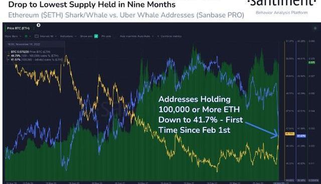 “自11月4日以來,以太坊的100,000多個ETH地址集體大幅減持。這條藍線可能與FTX地址改組有關,與價格有些相關。但在這些獨特的情況下,這可能是反常的。”
