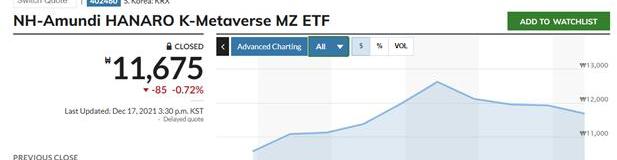 NHAmundi資產管理推出的NH-AmundiHANAROK-MetaverseMZETF于2021年10月15日開始正式交易。截至2021年12月17日,該基金收盤于11675韓元,上市至今漲幅10.51%。