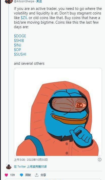 “如果你是一個活躍的交易者,你需要去波動性和流動性所在的地方。不要購買像ZIL這樣的停滯硬幣或類似的舊硬幣。購買有出價并且正在大漲的硬幣。最近幾天像這樣的硬幣有:DOGE、SHIB、INJ、OP、SUSHI和其他幾個,”他說。