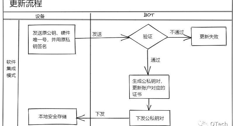 然而,若將密鑰直接固化在程序代碼中,則容易被攻擊者從flash中反匯編得到;若將密鑰以密文的方式直接固化在外部flash中,雖然可以規避前一種情況的發生,但密鑰燒錄的過程卻存在一定的安全風險,且不利于設備的流水線生產。因此,我們提供兩種集成方式來改造物聯網設備,使物聯網設備具備區塊鏈簽名能力,對應的我們提供兩種模式保障設備密鑰分發過程的安全,使物聯網設備在兼顧設備生產效率的同時,其唯一身份不可被盜用和篡改。