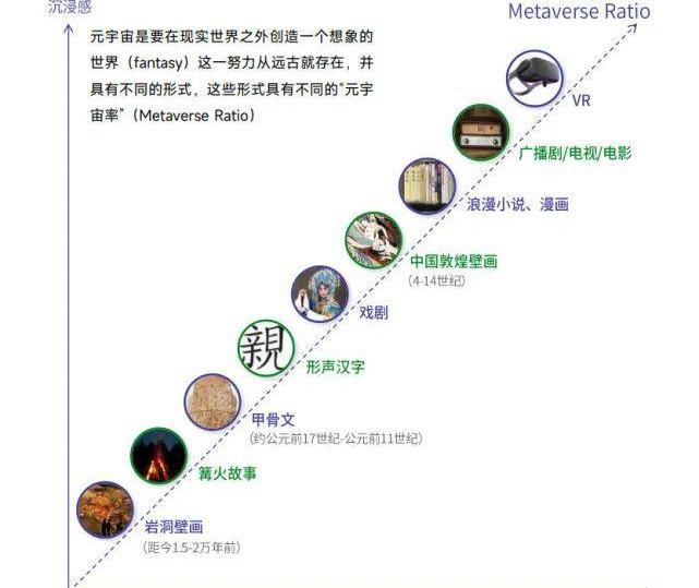 “元宇宙”體現在多個核心維度上,包括計算力、響應力、逼真性、沉浸性、互動性、用戶自主性、數字財產保護、數字貨幣支付等。不同公司在這些維度上的強弱不同或有所側重,但它們都可以是元宇宙公司。所以存在一個“元宇宙率”(MetaverseRatio)。從廣義上說,巖洞壁畫、敦煌壁畫、口語故事、文字、戲劇、2D和3D游戲等都是元宇宙技術,只不過它們的“元宇宙率”不同而已。完全的元宇宙是一條總在不斷退后的地平線,我們可以在多個維度上不斷接近它,但永遠無法完全到達它。
