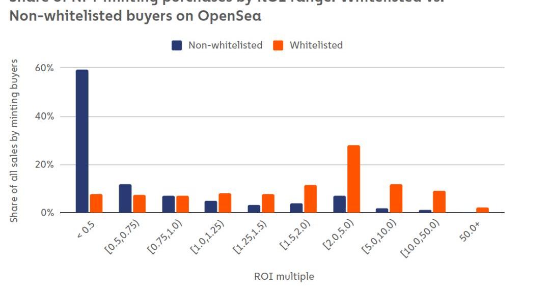 進入白名單可以有效提升投資NFT的ROI。OpenSea數據顯示,75.7%列入白名單并隨后出售其新鑄造的NFT的用戶獲利,而沒有被列入白名單的用戶則只有20.8%獲利。