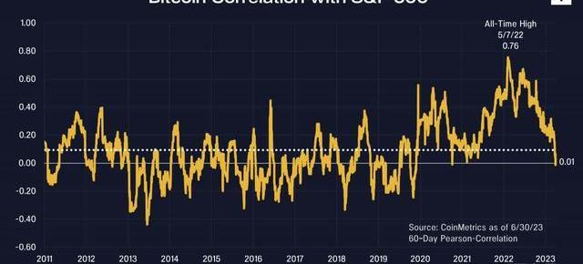 那些想要保護自己和財富免受這種不負責任的貨幣政策影響的人必須轉向貴金屬和比特幣。今年到目前為止,比特幣的表現優于所有其他投資,無視實際利率的上升。貝萊德潛在的現貨ETF最近在加密貨幣領域引發了新的興奮。此外,比特幣與股市之間的相關性已降至零。由于區塊鏈與利率無關,因此它與股票、債券和房地產等主要資產類別的相關性也應該非常低,而這些資產類別都受到利率的嚴重影響。