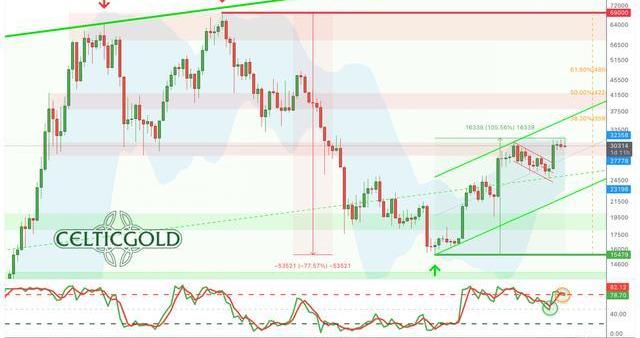 在周線圖上,比特幣強力突破了修正旗形形態。自那根重要的綠色突破蠟燭以來,價格一直徘徊在30,750美元至31,800美元之間阻力區的上邊緣附近。成功突破可能會導致快速上升至布林線上限、趨勢通道上限,以及隨后的38.2%回撤位35,924美元。