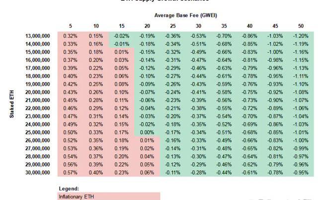 下表顯示了不同程度的質押ETH和平均基礎費用下的年度ETH供應增長。
