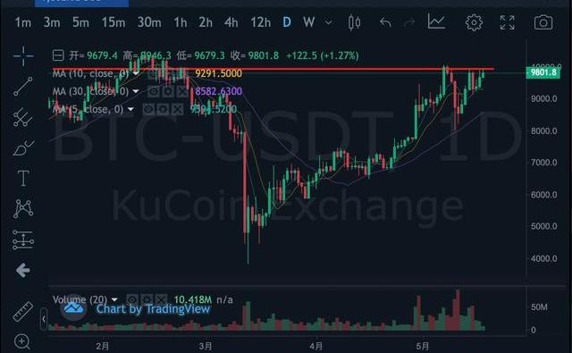 BTC:據庫幣全球站消息,比特幣仍在試探10000美金這個壓力位,目前報價9801美元,24小時漲幅1.27%。