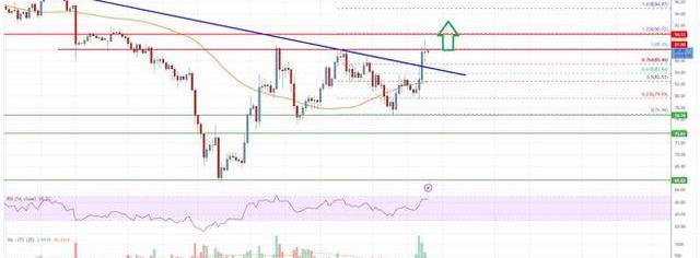 查看圖表,萊特幣價格明顯高于85美元和55簡單移動平均線。總體而言,如果價格突破88美元和90美元的阻力位,則價格可能獲得看漲勢頭。