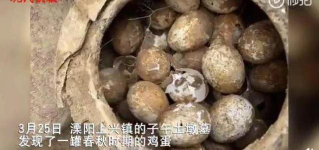 近日,江蘇溧陽上興鎮經濟開發890區的子午土墩墓中發現了一罐春秋時期雞蛋。雞蛋被滿滿當當地放在一個陶罐里,為了防止被破壞,裝雞蛋的罐子還有蓋子蓋著,盡管2500多年過去了,罐子里的雞蛋只破了一個。