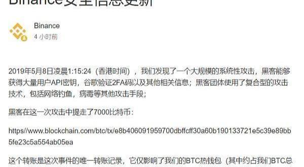 據幣安官方公告顯示:2019年5月8日凌晨1:15:24,我們發現了一個大規模的系統性攻擊。
