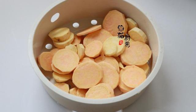 2.準備一些紅薯,或者紫薯也可以,切成薄片,放入蒸屜中提前蒸熟。