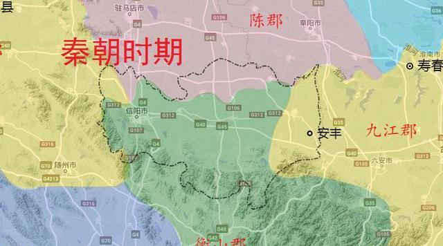 秦朝上圖為秦朝末期。此時今信陽市境內僅存在上圖一個安豐縣,屬九江郡管轄。