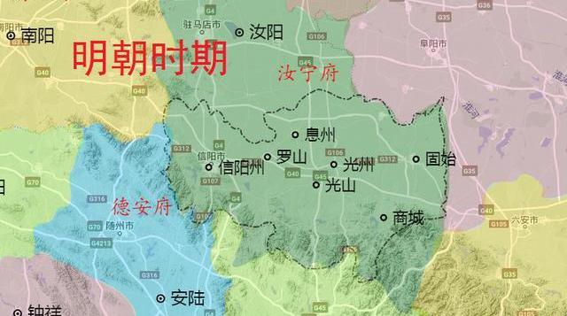 明朝上圖為公元1582年明朝時期。信陽州在明初降級為信陽縣,明成化十一年(1475年)又升為州,但是已經不轄縣,為散州,屬汝寧府管轄。光州則和元朝一樣,下轄數縣,上屬汝寧府。