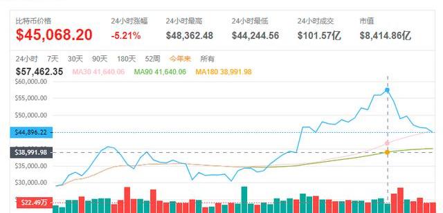 XRP/HKD+1.79%2021年以來,比特幣價格屢創新高,曾一度攀升至57462.35美元。雖然近期比特幣價格有所回調,但仍然維持在45000美元左右。