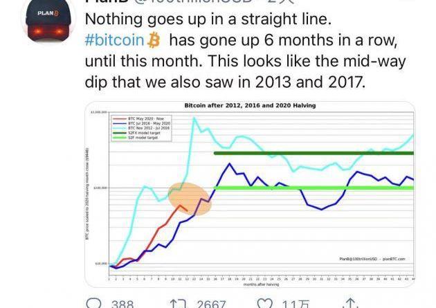 PlanB在加密貨幣行業中以他的比特幣Stock-to-Flow模型而聞名。這個模型本質上是預測比特幣的價格會隨著其減半和稀缺性的增加而上漲。根據TradingView的數據,在過去的幾個月里,比特幣的價格超過了歷史高點,65000美元左右。在接下來的幾天里,比特幣繼續下跌,到4月23日接近47500美元,跌幅約為26%。不過,根據PlanB的推文,這一走勢與之前的比特幣牛市周期大致相同。