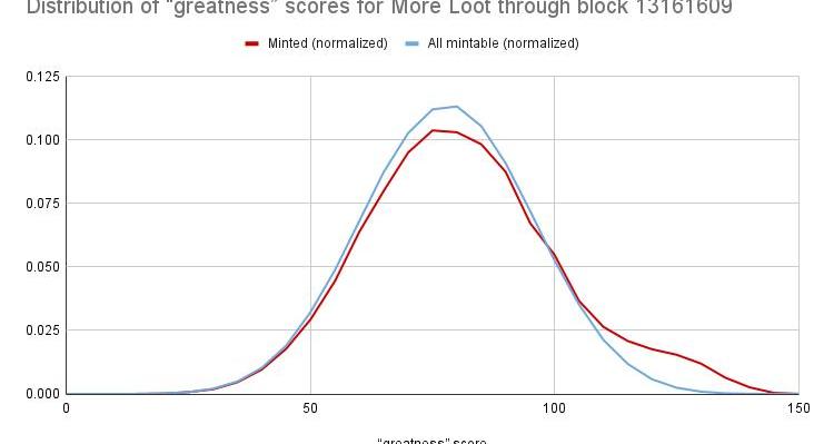 上圖顯示了MoreLootBags可供鑄幣與實際鑄幣之間的分布差異。它包括目前該系列中超過130萬個Bag的"greatness"分數。