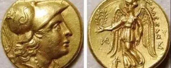 公元前332年,亞歷山大在推羅城獲得勝利,開始鑄造標準金幣。為了使新幣通行全國,幣面圖案采用了希臘世界最著名的神像和徽標。金幣的正面是英姿颯颯的智慧與戰爭之神雅典娜頭像,背面是勝利女神尼姬站像。勝利女神一手持代表勝利的花環,一手持代表海軍勝利的船飾,喻指亞歷山大所獲得的制海權。據說,這個勝利女神像是根據雅典城某個著名紀念碑上的神像雕刻而成。