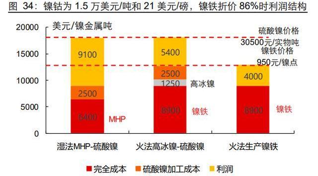 盈利:i.以印尼項目的行業平均情況為例,在一系列單噸投資、折舊等假設下對不同鎳鈷價格下HPAL的單噸盈利進行測算,其中14000美元/噸的LME鎳價和18美元/磅的MB鈷價下HPAL項目的噸鎳利潤1約在3萬人民幣左右;ii.在16000美元/噸的LME鎳價格下,當高冰鎳較金屬鎳的折價系數與鎳鐵較金屬鎳的折價系數之間的差值大于8%時,生產高冰鎳的毛利會大于鎳鐵毛利,完全成本在8800美元/鎳噸的鎳鐵廠商或將出現較強的向高冰鎳進行轉產的動力。