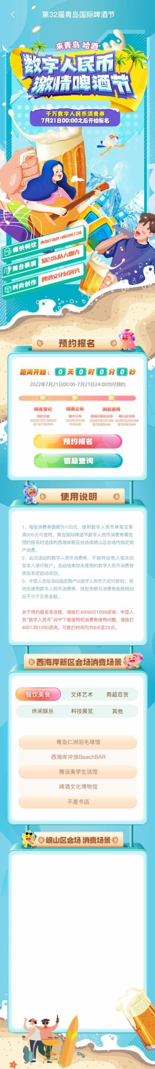為貫徹落實中央、省和市委市政府“促消費、穩增長”相關工作部署,進一步發揮數字人民幣服務實體經濟和百姓生活作用,提升數字人民幣普惠性與可得性,青島市將在青島國際啤酒節期間舉辦“數字人民幣激情啤酒節”青島國際啤酒節數字人民幣消費券活動。