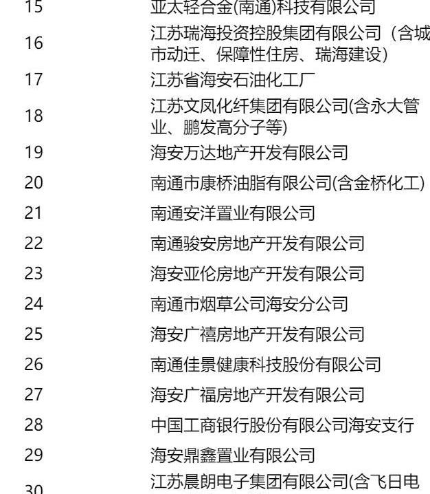 海安市比較有名的企業包括:江蘇省蘇州建設集團股份有限公司,一個公司一個月繳納稅收就接近7個多億。江蘇海安農村商業銀行股份有限公司。華新建工集團有限公司。江蘇聯發集團股份有限公司。南通市達欣工程股份有限公司。海安市城建開發投資集團有限公司江蘇鐵錨玻璃股份有限公司南通久和房地產開發有限公司西蒙電氣(中國)有限公司海安極富房地產開發有限公司南通金石置業有限公司江蘇信拓建設(集團)股份有限公司中國天楹股份有限公司國網江蘇省電力有限公司海安市供電分公司