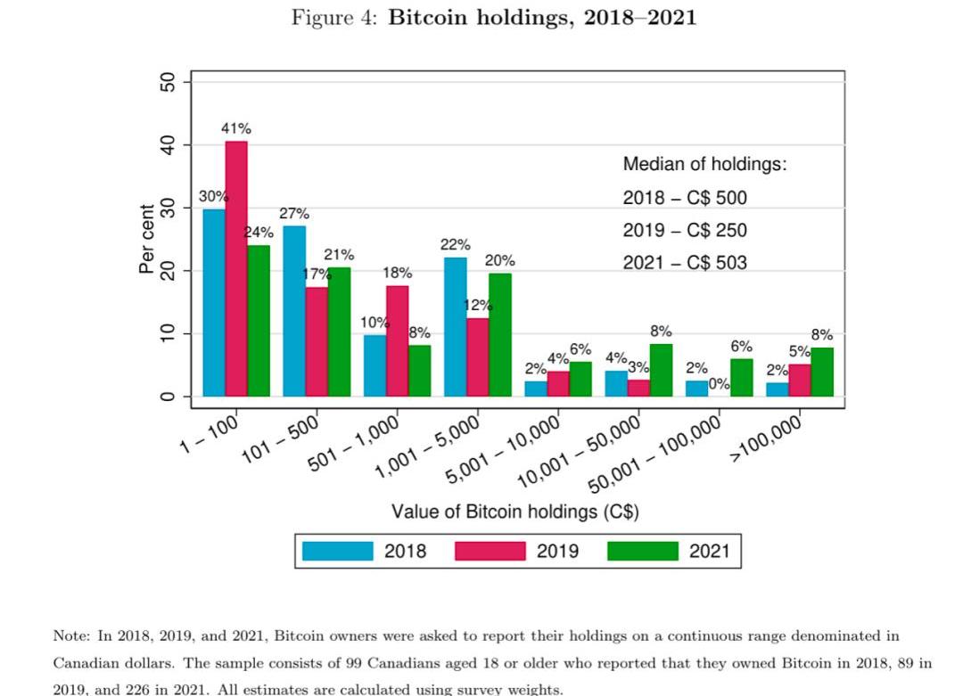 2020年和2021年比特幣采用率激增的原因是新所有者在很大程度上將比特幣視為一種投資。最近采用者持有的比特幣數量往往很少,這可能是因為前兩年比特幣價格上漲。與2019年相比,相對更多的比特幣所有者報告使用移動應用程序在交易所獲取比特幣,這表明此類創新降低了進入門檻。最后,新所有者的涌入改變了比特幣所有者的人口構成。例如,與往年相比,收入較高、金融素養較高的加拿大人在比特幣持有者中所占比例相對較大。總的來說,結果表明比特幣正變得越來越明顯是一種投資產品,而不是一種支付工具。