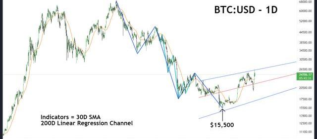 在接下來的1.5年里,比特幣的價格應該會在30周的簡單移動平均線和冪律區間的支撐下向上傾斜。