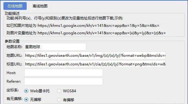 在顯示的自定義地圖對話框內,輸入影像的URL和標簽的URL,坐標系選擇web墨卡托,有無偏移選擇無偏移,如下圖所示。