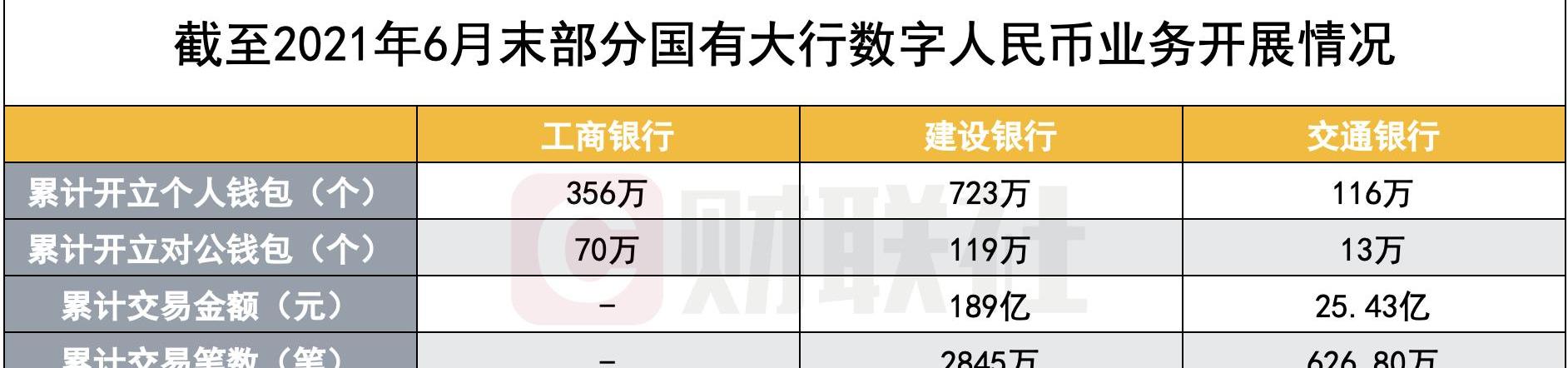 從已披露的情況看,建設銀行的開立錢包數量位居首位,截至6月末,共開立個人錢包723萬余個、對公錢包119萬余個;其次為工商銀行,累計開立個人錢包356萬個、對公錢包70萬個;交通銀行的個人錢包數量也突破了100萬個。