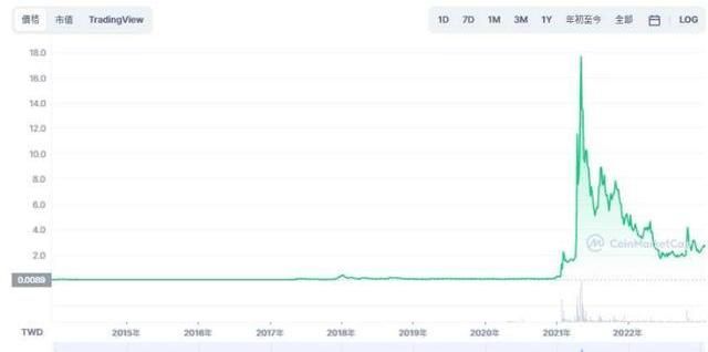 事實上,狗狗幣的發行量大、易挖掘的特性,使得發行初期價格一直不高;也在2017-18年的虛擬貨幣泡沫期間上沖下跌,狗狗幣在當時鼎盛時期最高的交易價格達到0.018美元,市值超過20億美元。