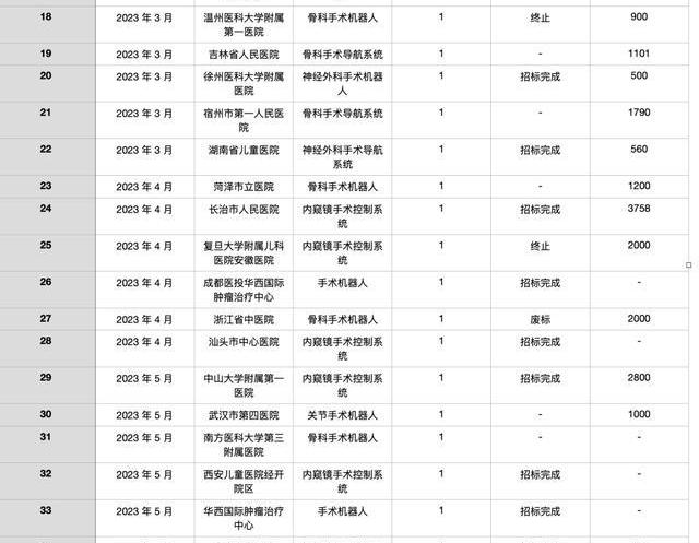 以下是2023年1-6月,國內醫院手術機器人招采情況詳情: